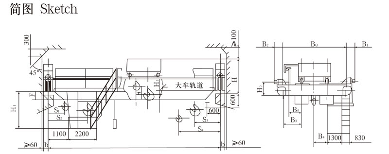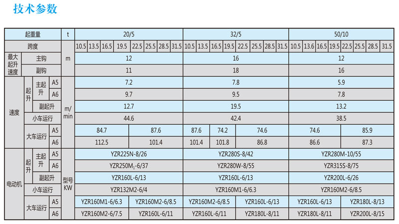 QD型吊鉤橋式起重機,主要由橋架、大車運行機構(gòu)、小車、電器設(shè)備等組成。根據(jù)使用頻繁程度不同,分為A5、A6兩種工作級別。起重量為5-120T,跨度為7.5-35.5米,工作級別為A5—A6,工作環(huán)境溫度為-25℃--40℃。